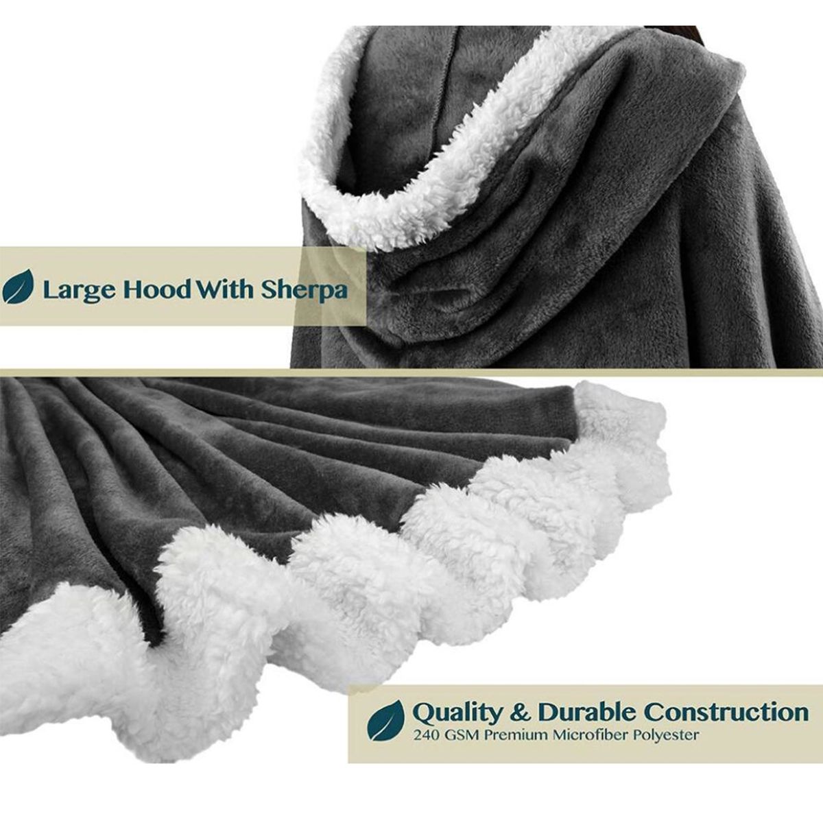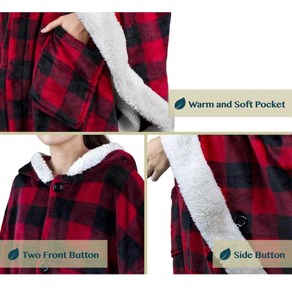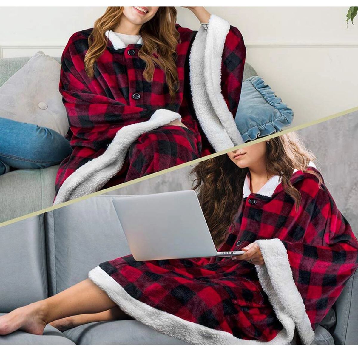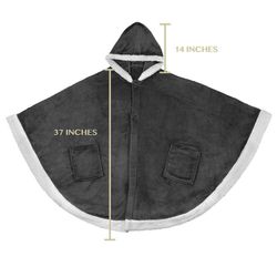 Be cozy in style and warmth with our Angel Throw Wrap blanket poncho with hood, pockets and sherpa trim. So soft, silky and cuddly you won't want to take it off. Perfect to lounge and relax around home, on sofa/coach, watch TV, nap, or read. Roomy and easy to wear, just slip over your head like a poncho. Adjustable fit with button neck and sleeves. Comes with 2 pockets for cell phones, remotes, and essentials. Made from soft 240 GSM microfiber polyester and plush sherpa trim. Fleece poncho shawl is designed to keep your hands free and mobile while staying warm and comfortable